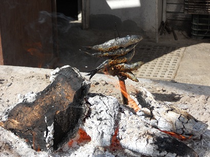 We decided to stay at the bar, on high stools and around tall round tables, and order from the tapas and racion menu (Racion is a more substantial portion than a tapa, and often enough for two or three of you to share). We had boquerones (anchovies) on toast, peppers stuffed with salt cod, morcilla (black pudding), grilled pork loin in tiny baguettes, meltingly tender, a huge salad of the most delicious green tomatoes that you get here, with hearts of palm – I can’t remember whether we had anything else to eat, but the menu is pretty vast just in the bar area.